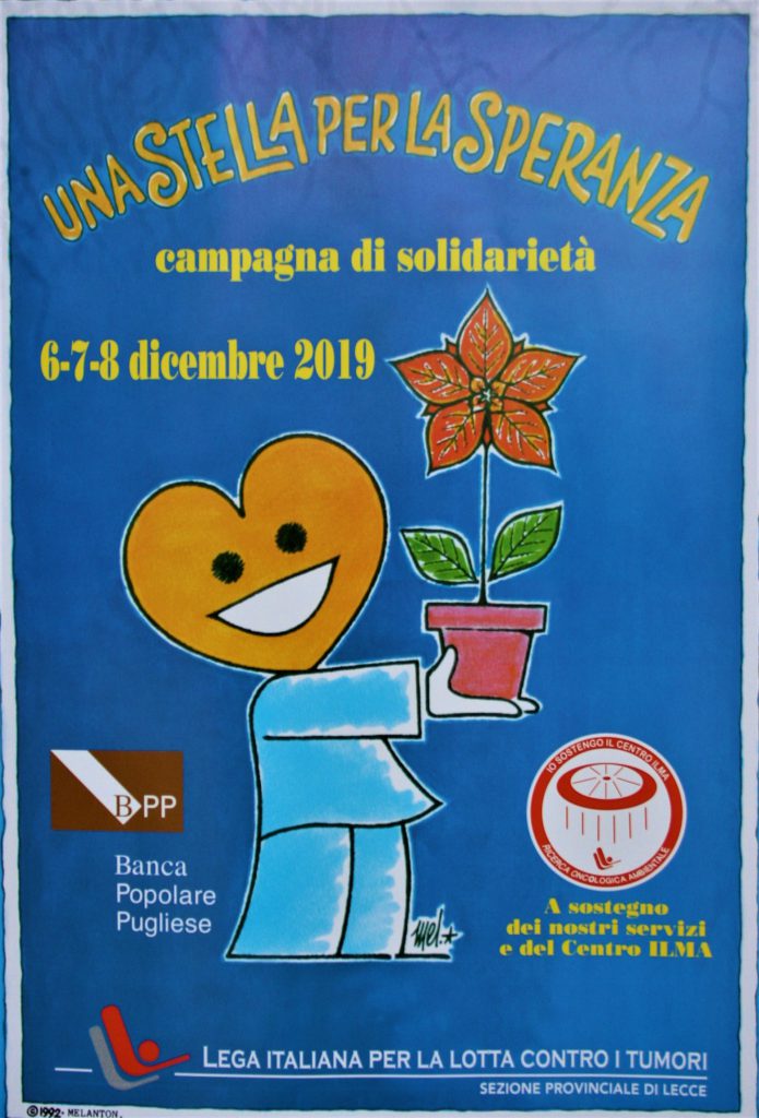Venerdì 6, sabato 7 e domenica 8 dicembre 2019, i volontari e le volontarie della LILT di Lecce saranno nelle piazze dei Comuni della Provincia (in tutte e tre o una di queste date a seconda dei Comuni) in occasione del tradizionale appuntamento giunto al 28° anno della Giornata della Speranza, con la vendita delle Stelle di Natale per la lotta contro il cancro. La campagna di raccolta fondi è a sostegno dei servizi gratuiti LILT e del Centro Ilma.