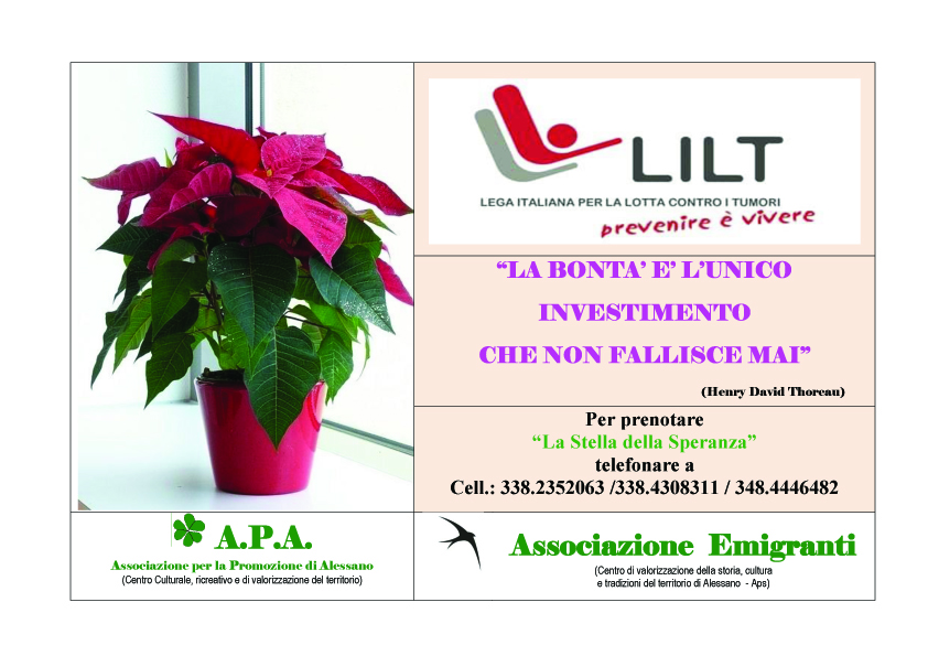 L’8 dicembre 2021, i volontari della LILT insieme alle Associazioni A.P.A. ed EMIGRANTI, con il patrocinio del Comune di Alessano, saranno in piazza, in occasione del tradizionale appuntamento della “Giornata della Speranza”, con la vendita delle “stelle di Natale”.